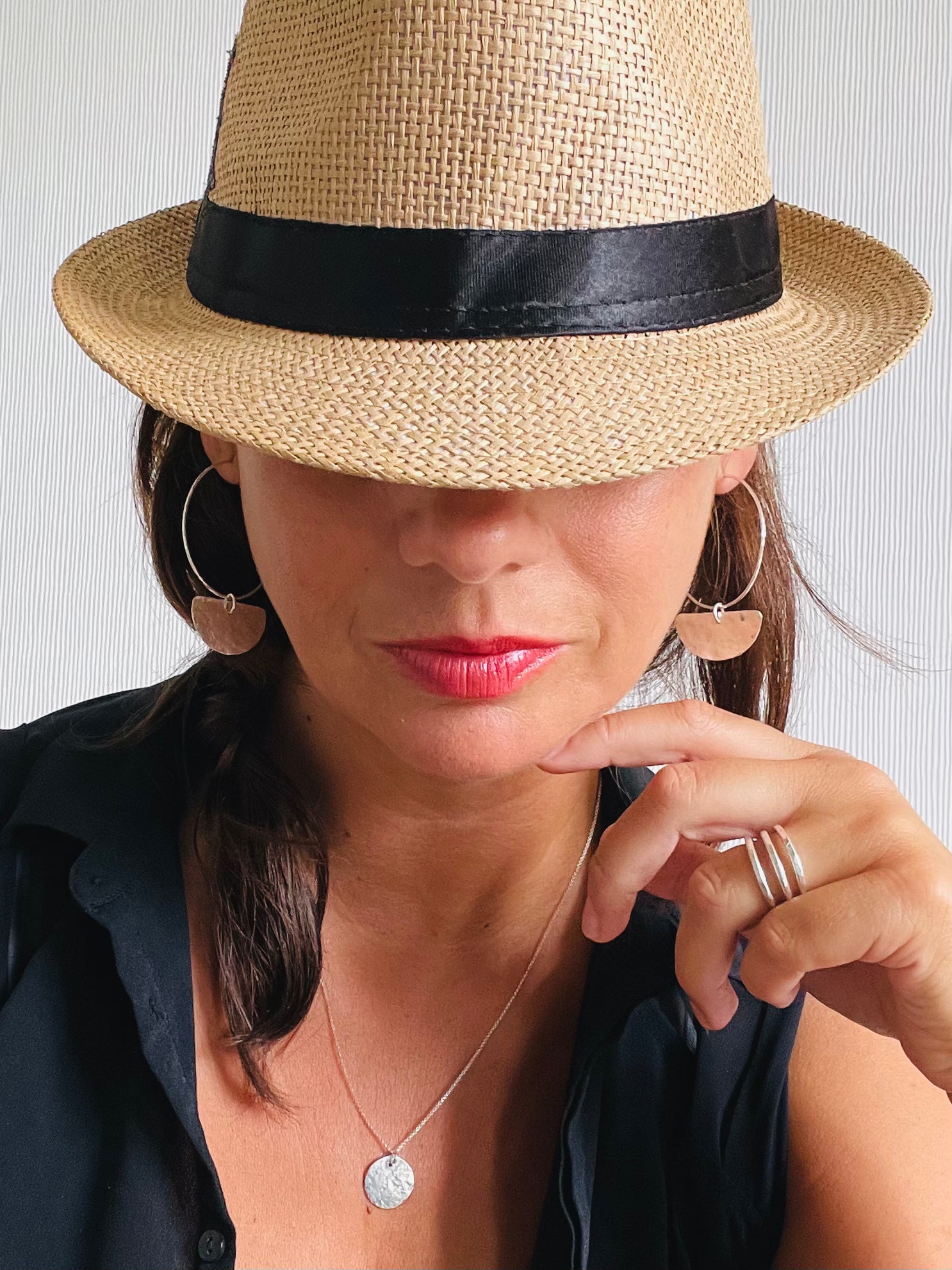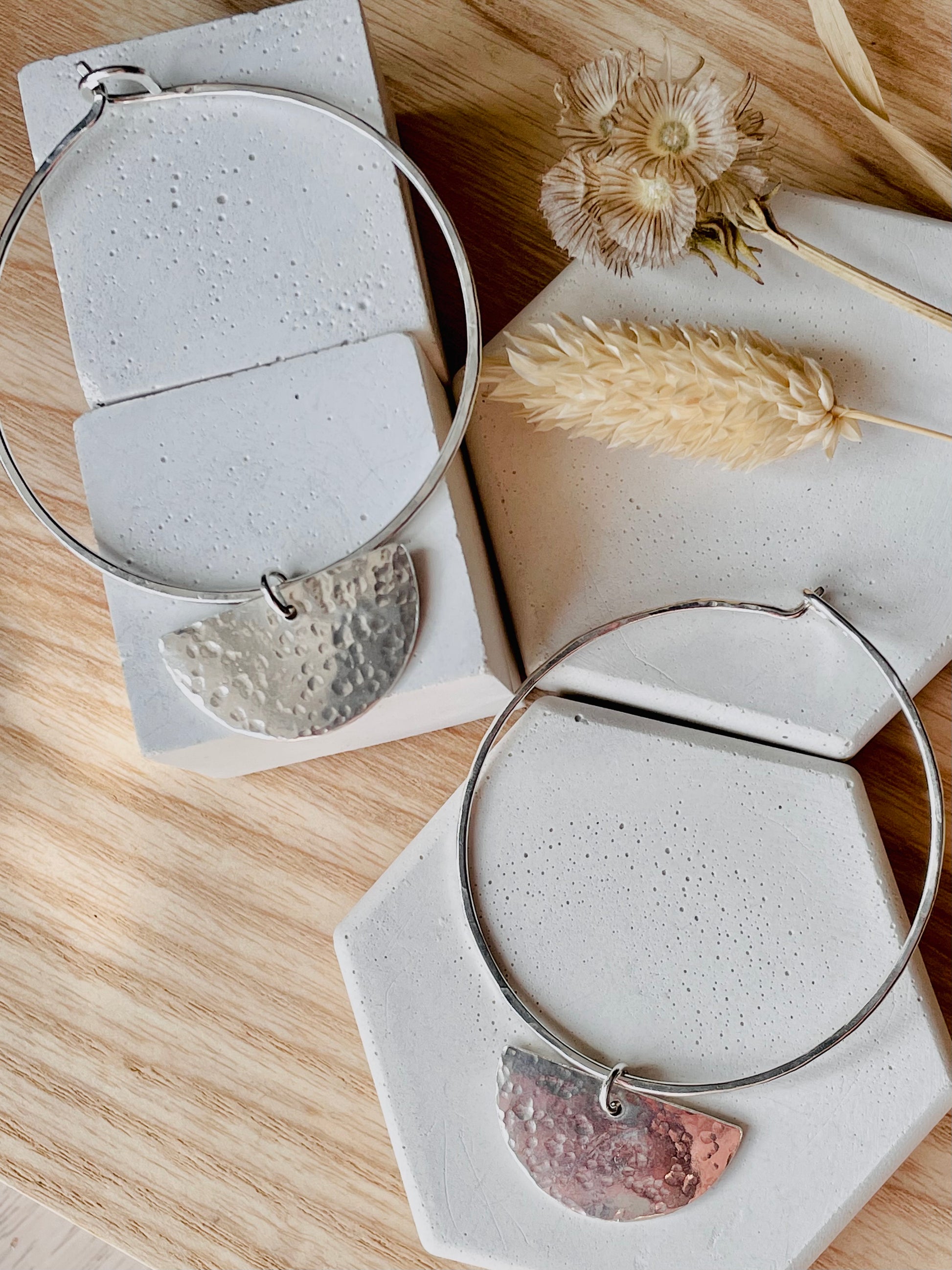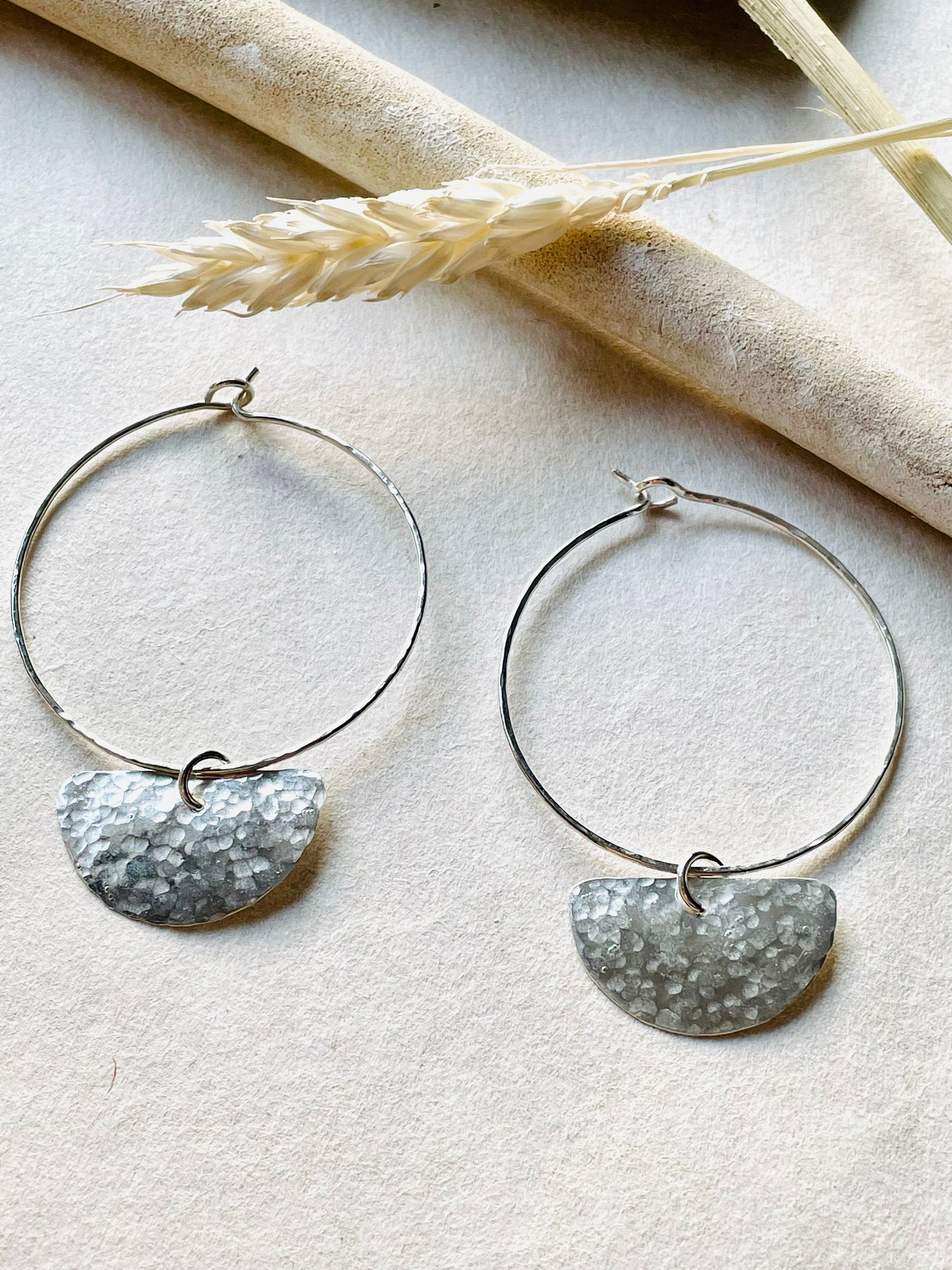 Handmade hoop-earrings and hammered texture. The beauty and the energy of the moon is an inspiration to create this design.